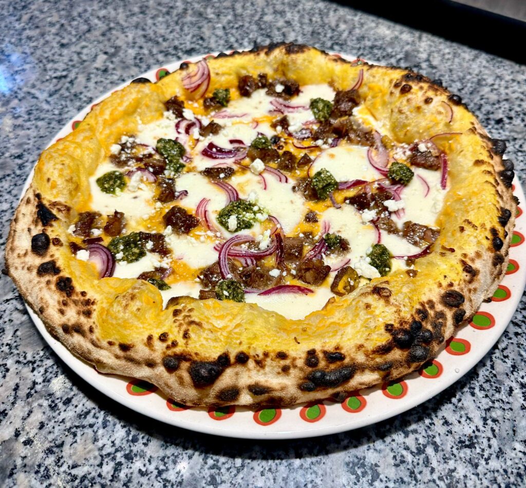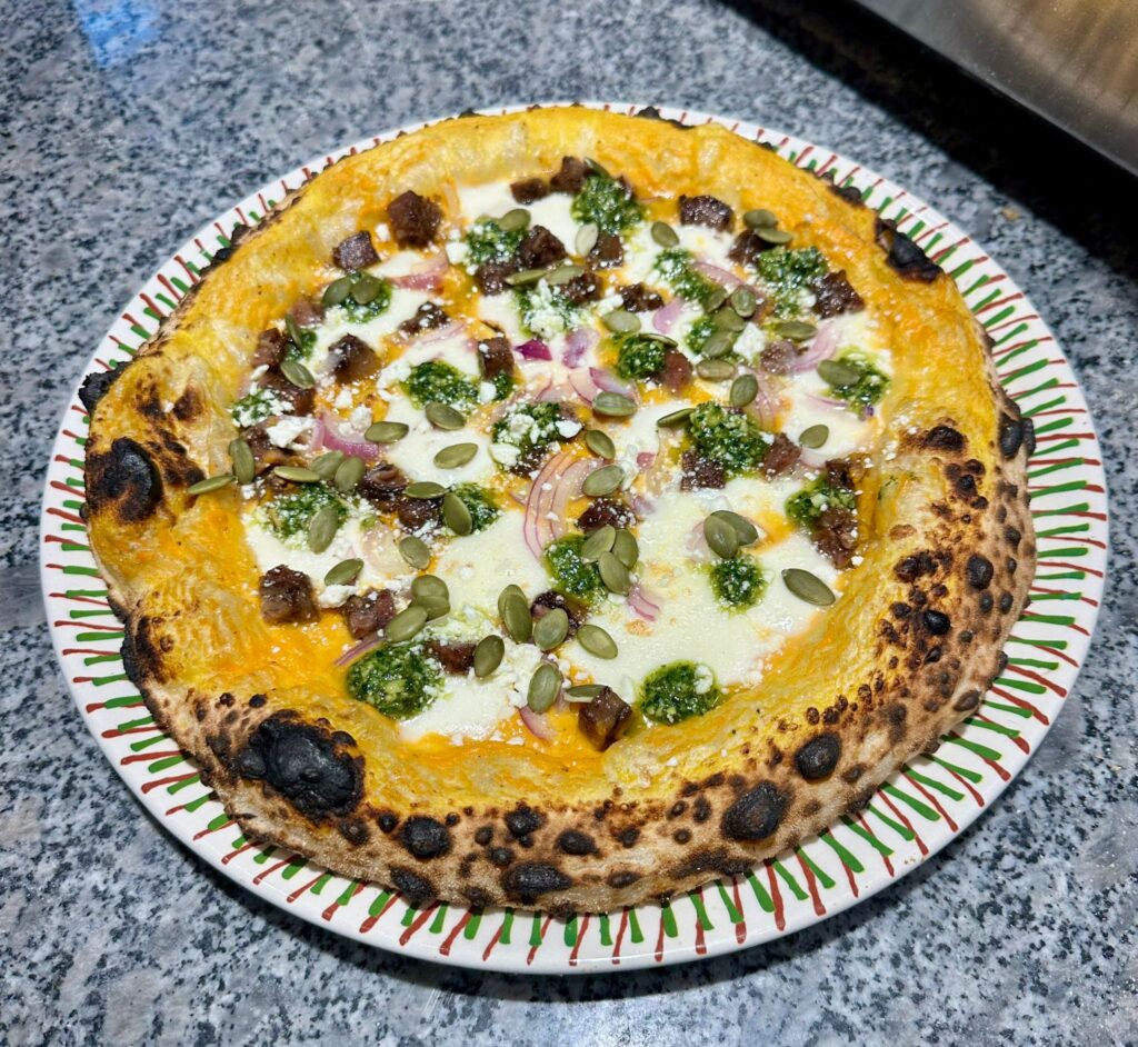 Pizza çeşitlerimiz tarımsal mevsim takvimine göre aylık olarak değişiyor. Restoranı ilk açtığımızda yaz sezonundaydık. Dikenli incirli, şeftalili ve mor incirli pizzalar yaptık. Şeker pancarı ve bal kabağı içeren pizzalarımız da oldu. İçinde bulunduğumuz sezonda ise en çok hasadı yapılan ürünlerden biri ayva olduğu için ayvalı pizza sunuyoruz. Tarım sezonlarına göre her ay pizzalarımız değişiyor. Restoranımıza gelen misafirlerimiz her ay farklı bir pizza çeşidiyle karşılaşıyor. Sabit menülerle çalışmıyoruz.